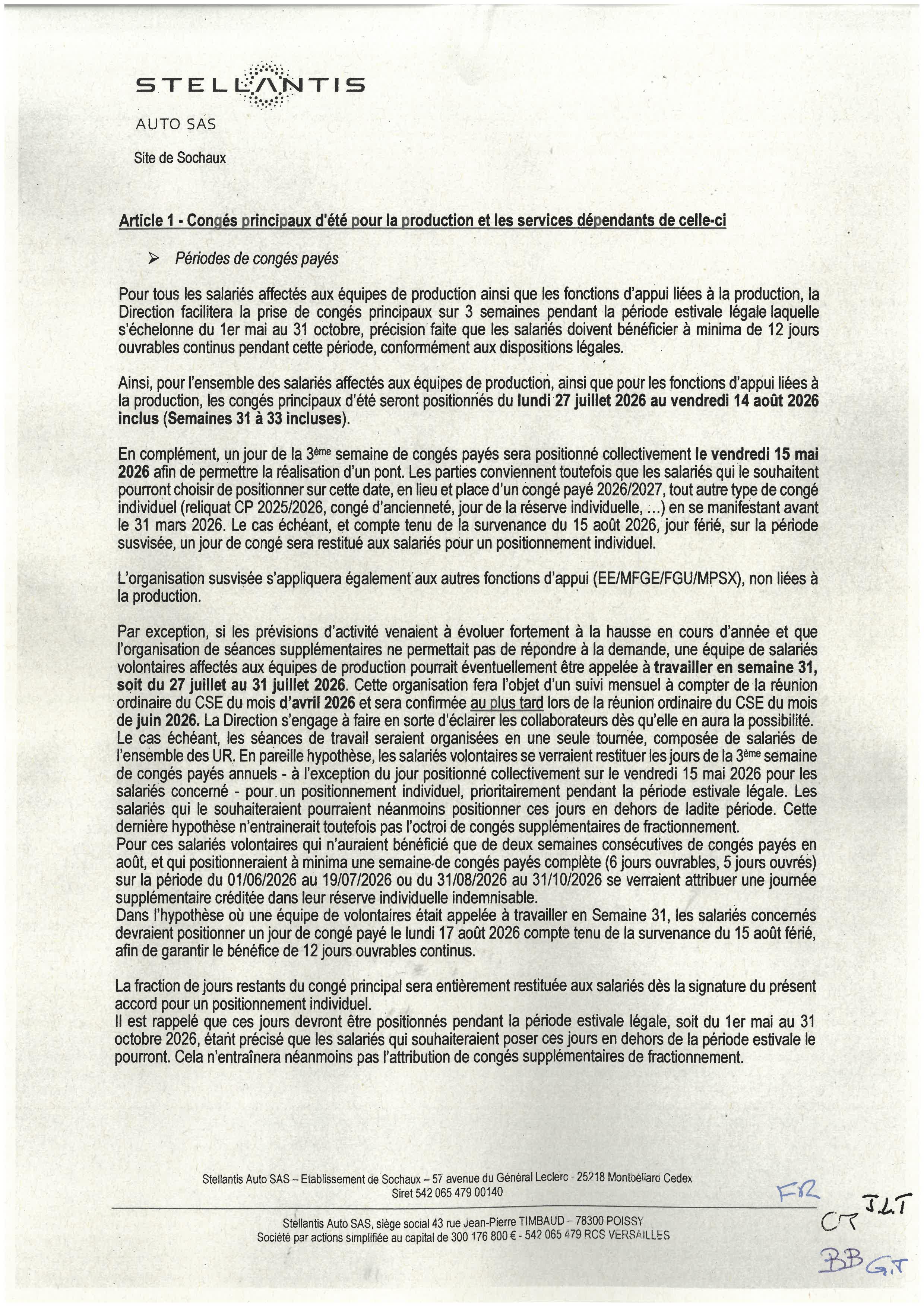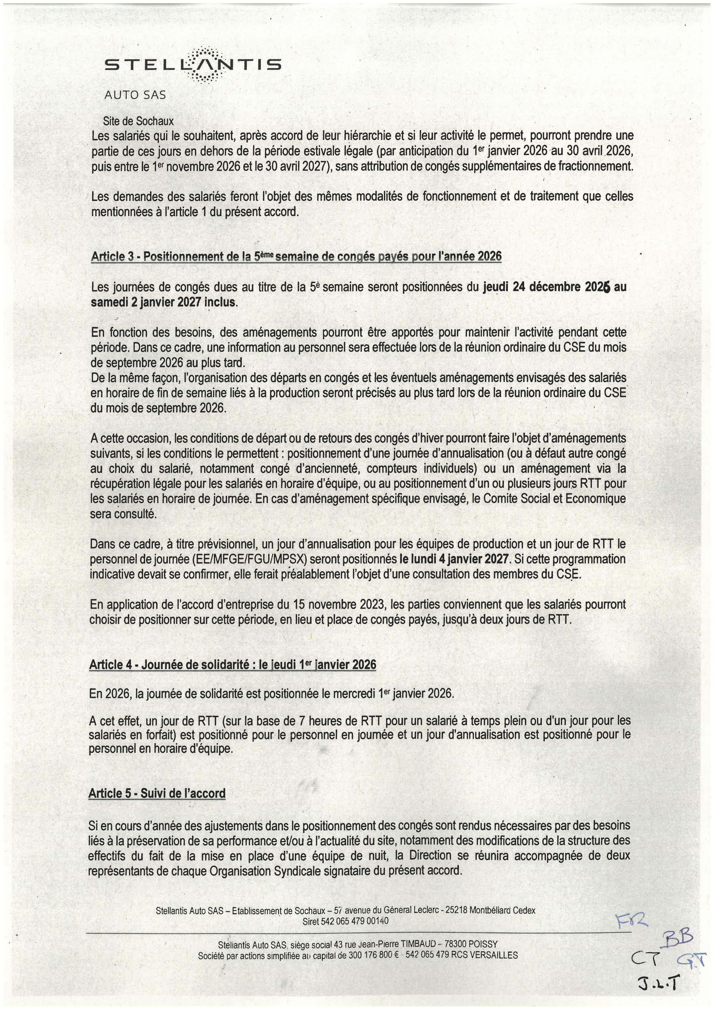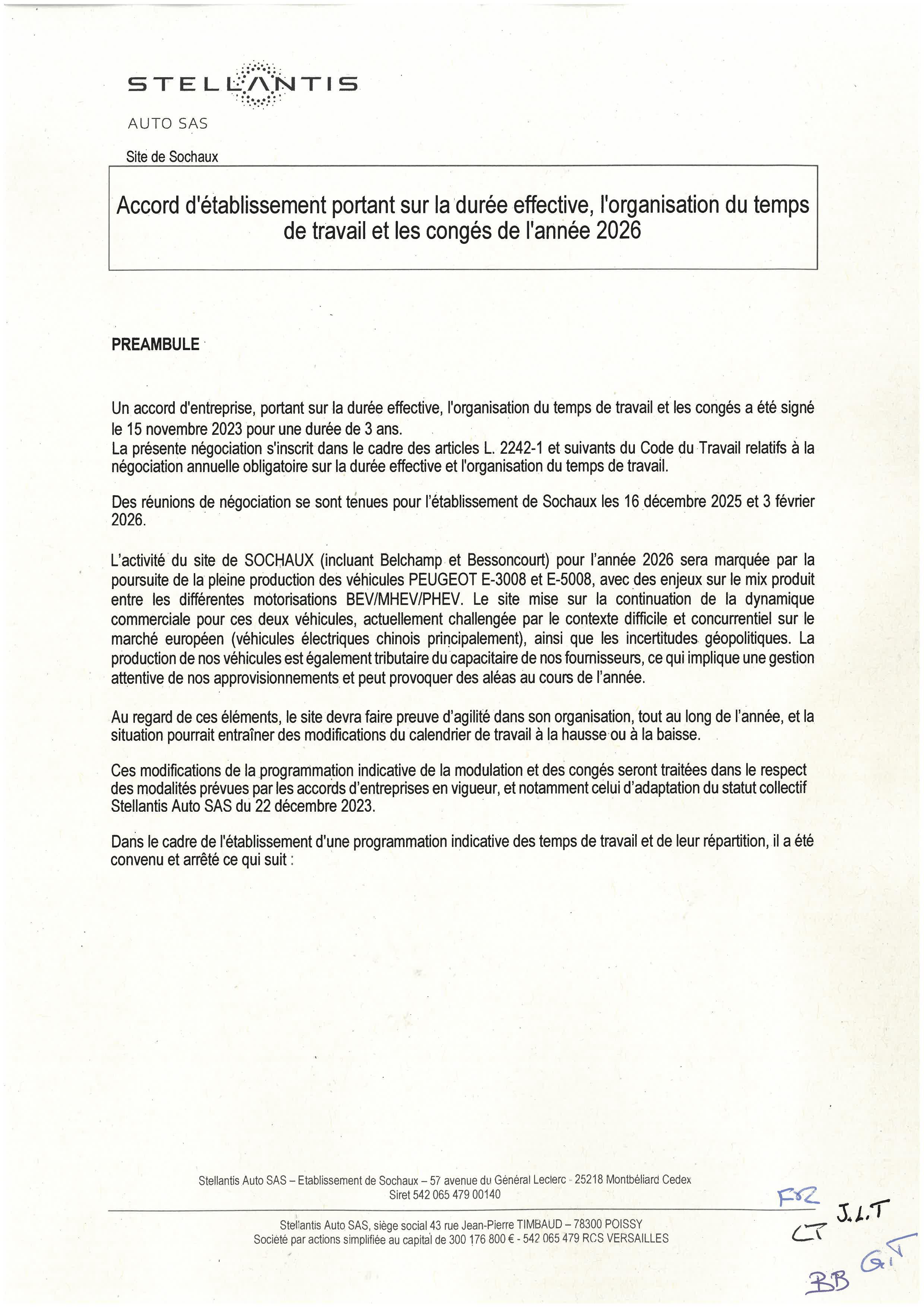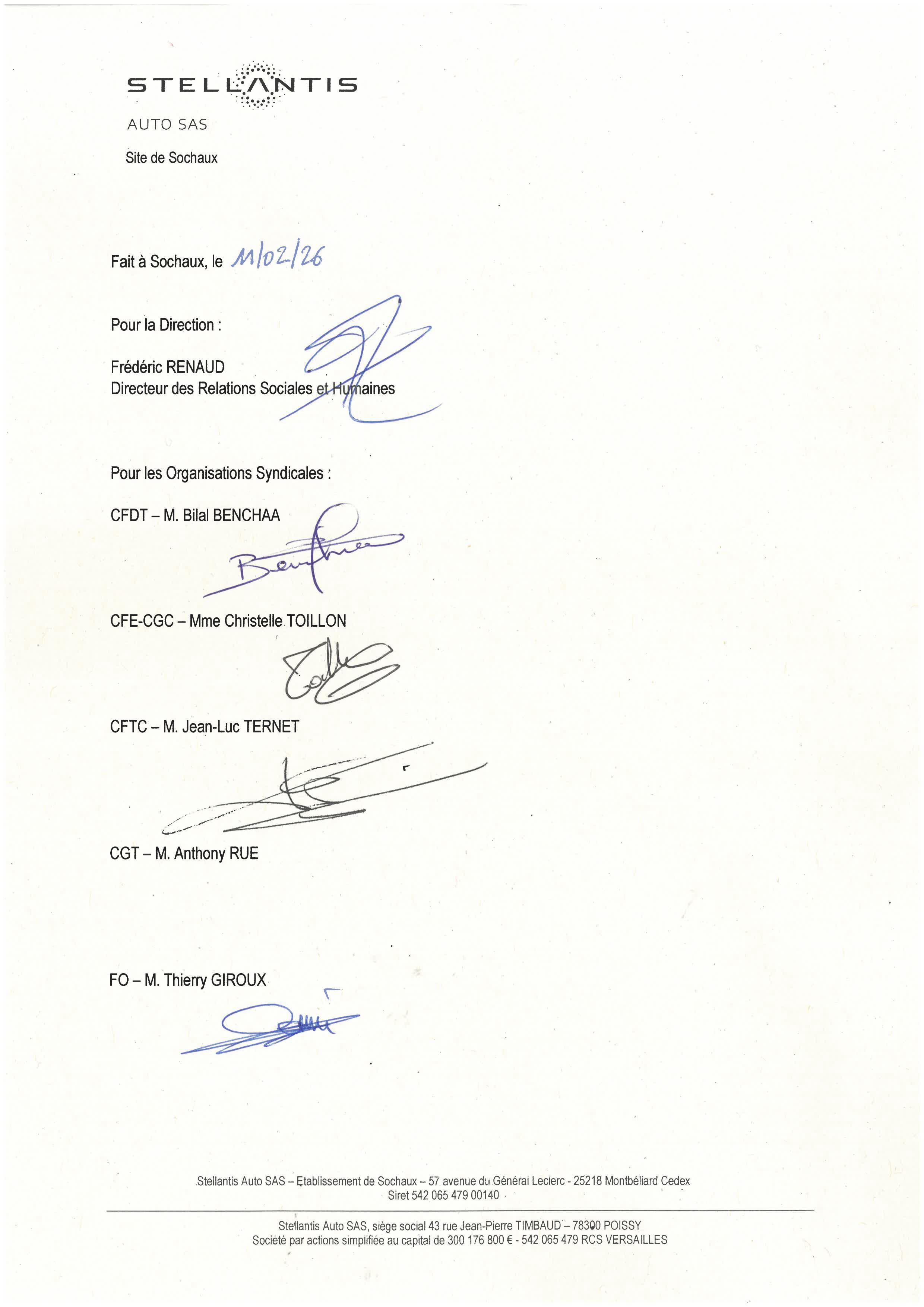 Sochaux - Accord d'établissement portant sur la durée effective, l'organisation du temps de travail et les congés de l'année 2026 - signé